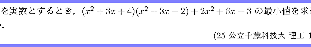 25年 公立千歳科技大 理工 1(3) 投稿日時: 2025年5月3日 投稿者: t-kame 上の問題文をクリックしてみて下さい.リンク:2次関数の最大・最小(置き換え)x^2+3x=t とおきましょう.